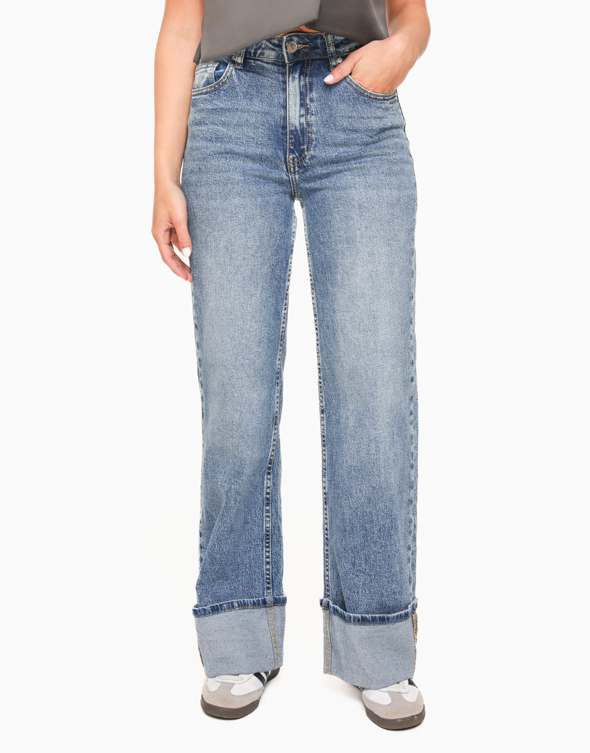 – Wasadvies: 30 graden- Droger: nee- Details: donkerblauwe jeans / rits- en knoopsluiting / riem lusjes / twee voor- en achter broekzakken / wijde pasvorm / stretchy / omgeslagen broekspijpen aan de onderkant- Model 1 lengte: 170 cm – Model 1 draagt: maat 36. – Model 2 lengte: 177 cm – Model 2 draagt: maat 38. Afmetingen bij maat 36. Buitenbeen  lengte. 108 cm. Binnenbeen lengte. 78 cm. Heup breedte. 31 cm