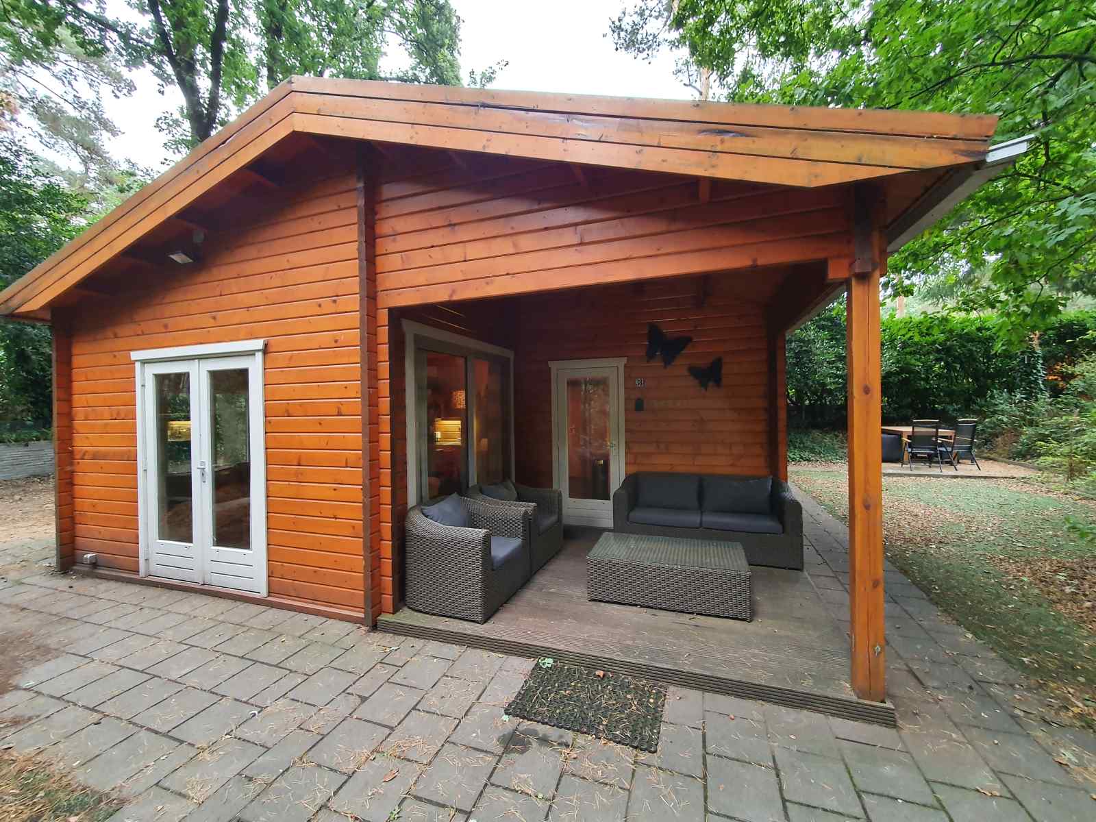 De gezellige woonkamer heeft een zitgedeelte met televisie en een eethoek. De keuken is van alle gemakken voorzien, waaronder een 4-pits gasfornuis, vaatwasser, combimagnetron, Senseo-koffiezetapparaat en waterkoker. Er zijn twee slaapkamers en een slaapzolder. De master bedroom heeft een tweepersoonsbed en een kledingkast. Ook staan hier een wasmachine en -droger. De tweede slaapkamer beschikt over een stapelbed. Tot slot is er een slaapzolder met twee goede losse matrassen. Het is hier 110 cm hoog en daarmee geschikt voor kinderen. De badkamer is voorzien van een tweepersoons bubbelbad, douchecabine en dubbele wastafel. Er is een separaat toilet. Via de openslaande deuren in de woonkamer heeft u toegang tot de heerlijke tuin. Hier vindt u naast een overdekt terras met loungeset, ook een zithoek met eettafel. Zo biedt dit chalet een heerlijke plek om te genieten van de groene omgeving.