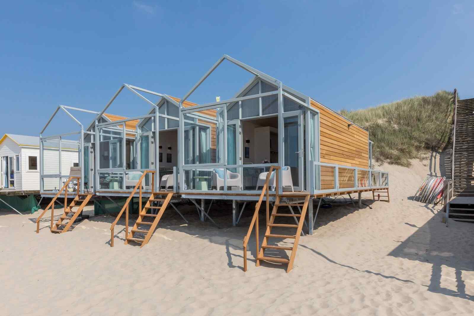 Aan de voorzijde van het vakantiehuis is een overdekte veranda met een fantastisch uitzicht. De woonkamer heeft een zithoek met een bank. Naast het gezellige zitje bevindt zich de ruime open keuken. De keuken heeft een aanrecht met voldoende werkruimte en is voorzien van een gaskookplaat, koelkast met vriesvakje, combimagnetron, koffiezetapparaat (filter), waterkoker en broodrooster. Het slaapstrandhuis heeft een tweepersoonsbed (160×200) en een slaapkamer met een stapelbed. Het achterterras kun je zowel via buiten als binnen bereiken, je zit er heerlijk privé. Op het achterterras krijg je tevens toegang tot de aparte doucheruimte.