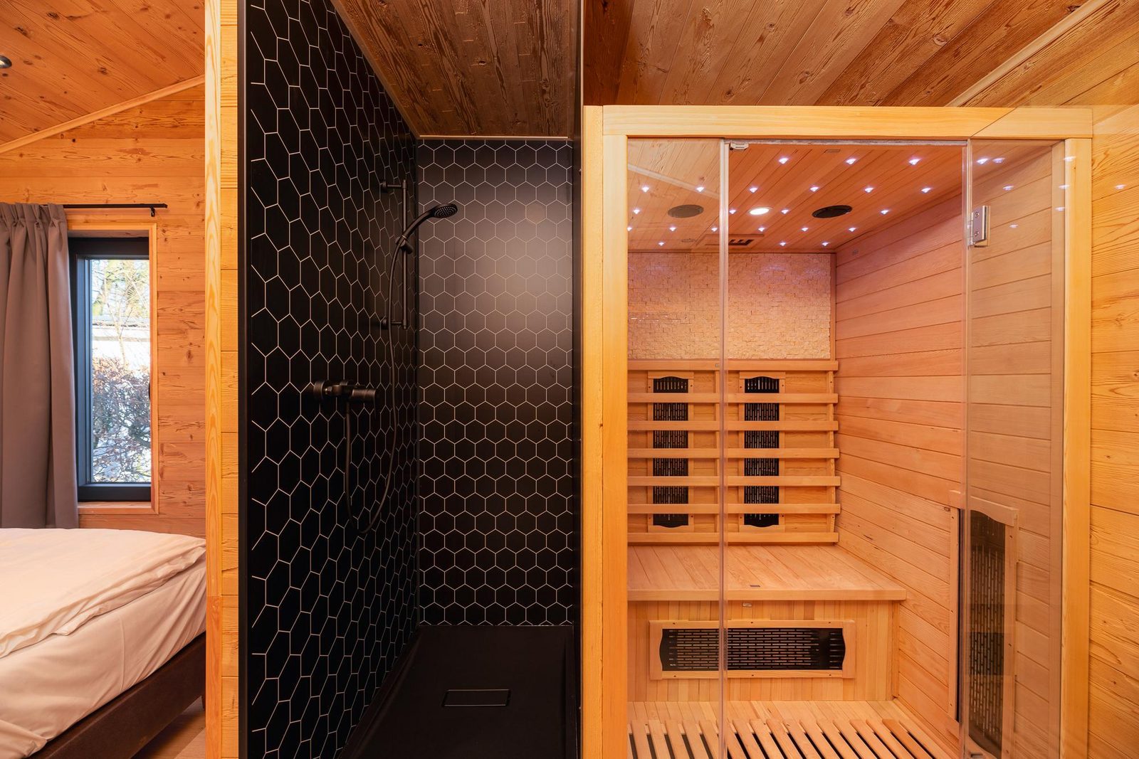 De lodge beschikt over één slaapkamers, met 1 badkamer voorzien van douche, wastafel, toilet en sauna.