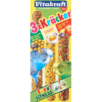 Deze Vitakraft® Kracker® mix is de ideale traktatie voor jouw parkiet # smakelijk, gezond en boordevol natuurlijke activiteit! Het pakket bevat drie verrukkelijke varianten: 1x Ei & graszaad 1x Abrikoos & vijg 1x Honing & sesam Elke knabbelstick is drievoudig gebakken op natuurlijk hout voor extra lang knabbelplezier. Zo kan je parkiet actief bezig zijn met zijn voedsel, precies zoals in de natuur. Tegelijkertijd helpt het knabbelen bij de natuurlijke slijtage van de snavel. De Kracker Mix is samengesteld uit hoogwaardige granen, zaden en vruchten, verrijkt met essentiele vitamines en volledig vrij van toegevoegde suikers. Een verantwoorde snack voor een vitaal en levendig vogelleven! Dankzij de handige cliphouder hang je de Krackers eenvoudig op in de kooi.